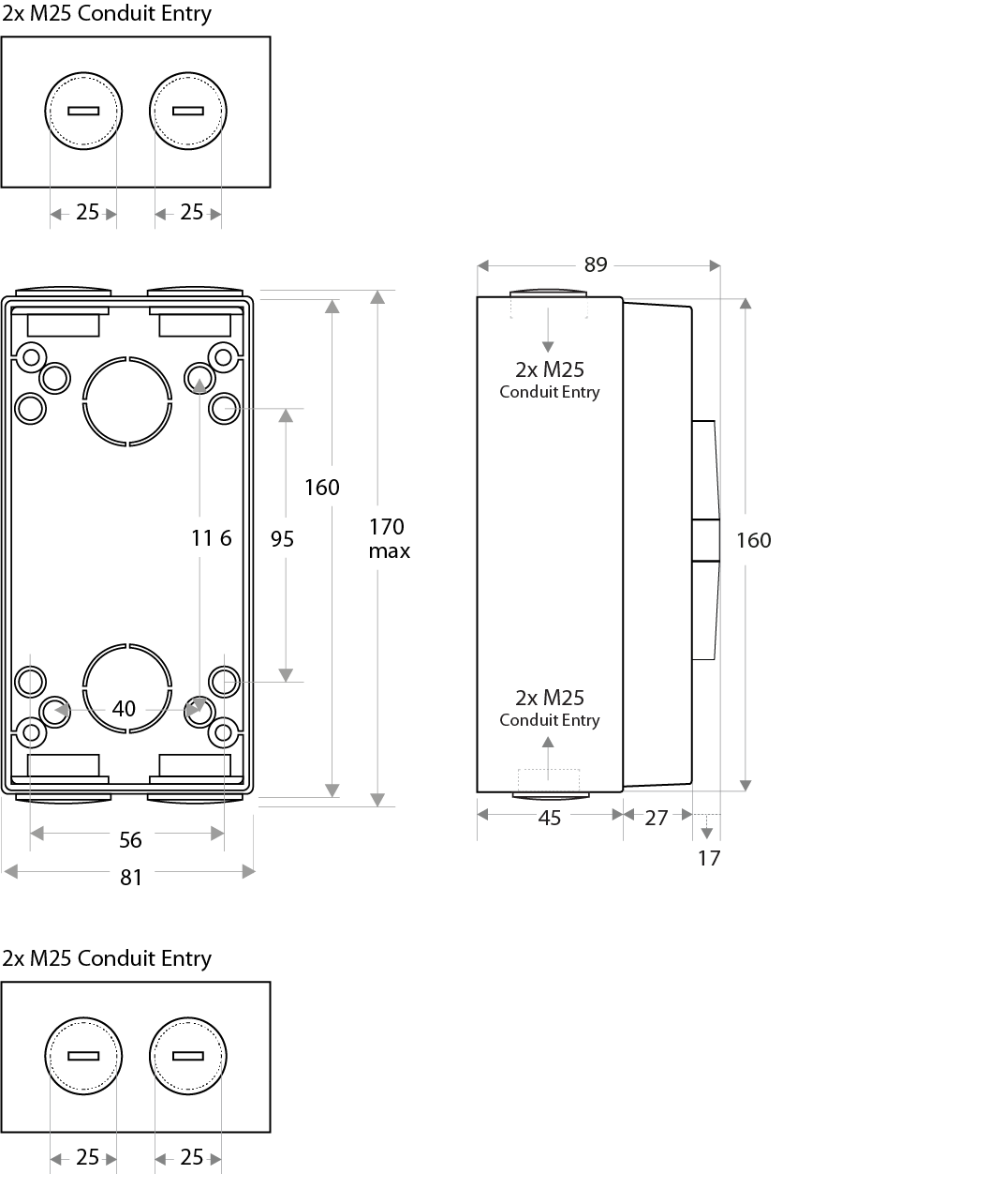 | - Dual top and bottom 25mm screwed conduit entries that allows four ways to surface wire the switch |